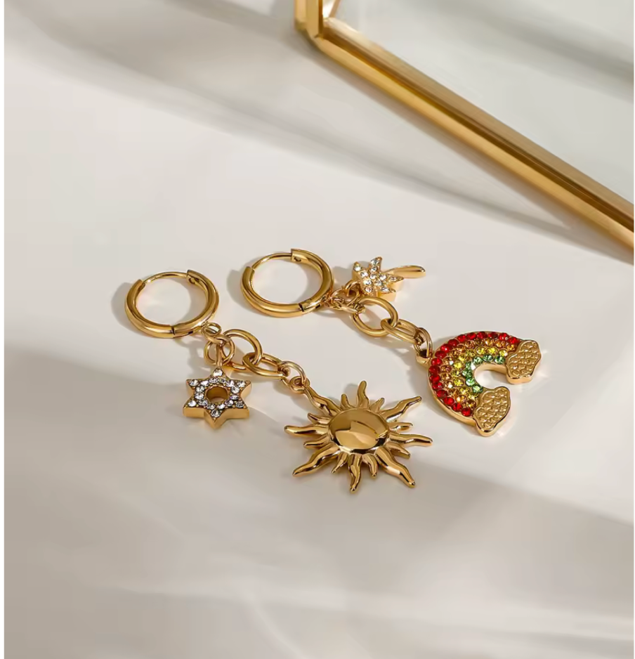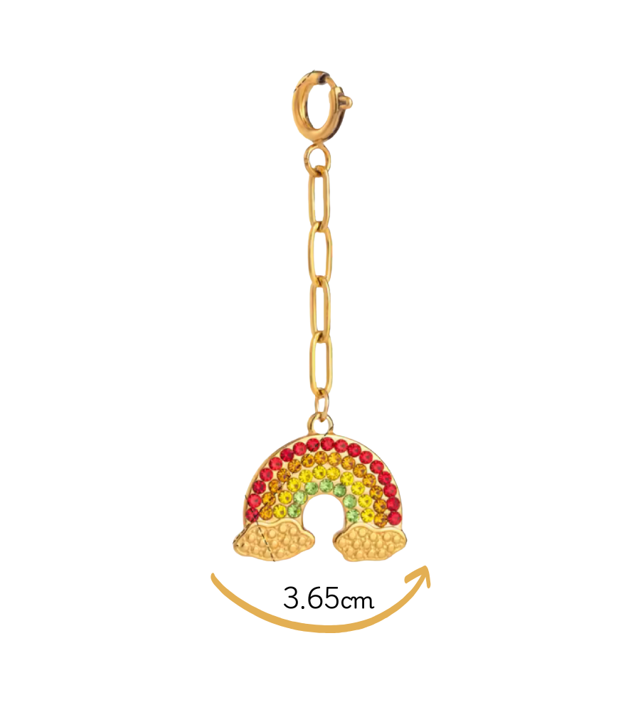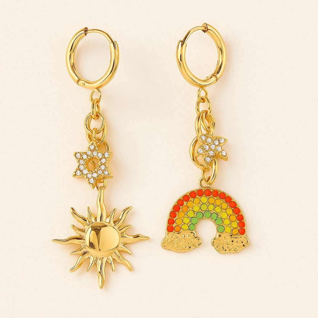 Due ciondoli eleganti che uniscono l’energia radiosa del sole alla magia colorata dell’arcobaleno. Questo raffinato ciondolo in colore oro unisce il calore radioso del sole e la magia colorata dell’arcobaleno, entrambi impreziositi da piccole pietre lucenti che ne esaltano la brillantezza. A completare il design, due piccoli ciondoli aggiuntivi, delicati e armoniosi, arricchiscono l’insieme con un tocco di eleganza e personalità.