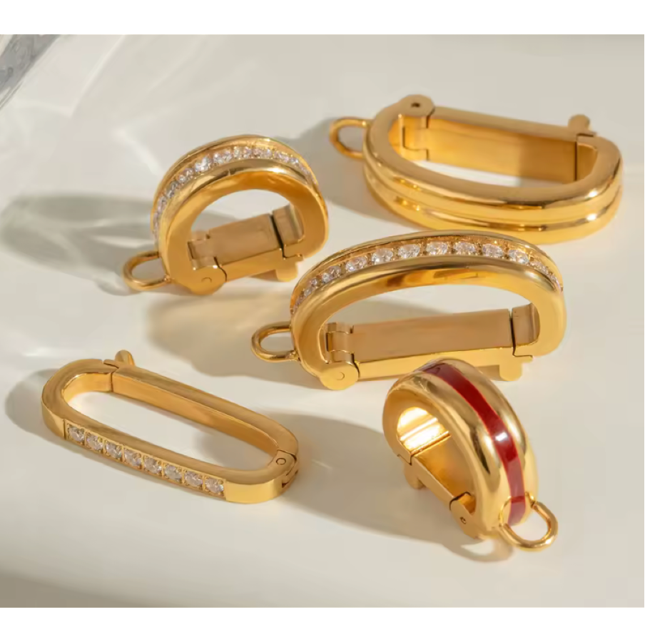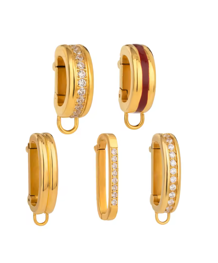 Scopri la collezione di ganci Orli in vari modelli, tutti realizzati in elegante color oro. Alcuni modelli sono impreziositi da delicate pietrine lucenti che aggiungono un tocco di brillantezza e raffinatezza. Leggeri e resistenti, questi ganci sono perfetti per completare ogni ciondolo con stile e versatilità, adattandosi a qualsiasi look con un’eleganza senza tempo.