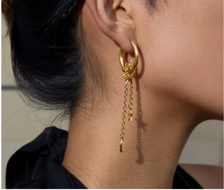 Il design asimmetrico e luminoso crea un movimento elegante e dona al viso un tocco magico e femminile. Perfetti da indossare ogni giorno o per valorizzare un outfit serale con un dettaglio unico e sognante.