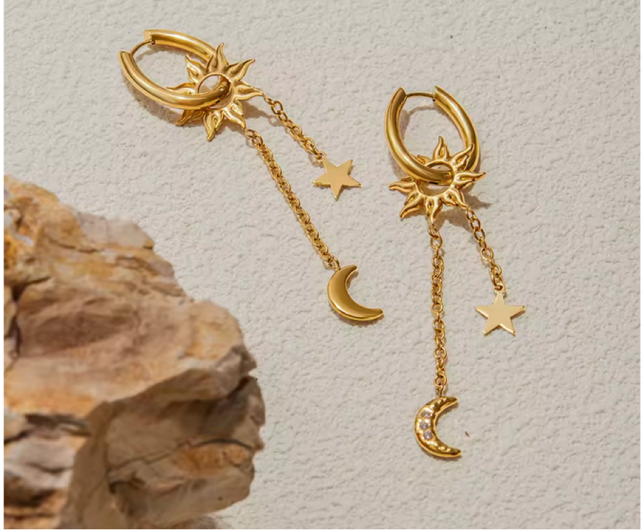 Illumina il tuo look con gli orecchini Sun & Moon Inciso, un accessorio dorato che unisce simboli celesti e dettagli delicati. Il cerchio principale è impreziosito da un piccolo sole decorativo, dal quale scendono due catenine leggere con charm a forma di stella e mezzaluna.
